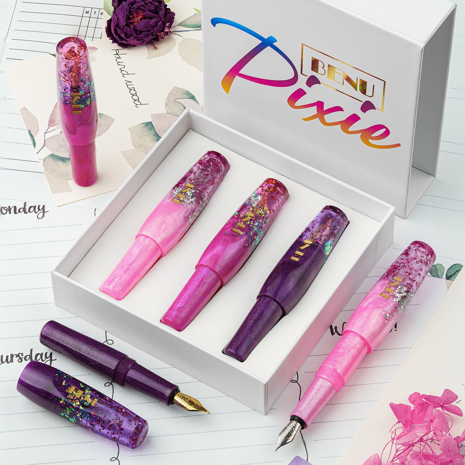 Each themed set contains three Pixie fountain pens, packaged together with a set of Fine, Medium, and Broad nibs. Crafted from acrylic resin with shimmering finishes, these pens bring playful color palettes and a premium writing experience in a compact design.