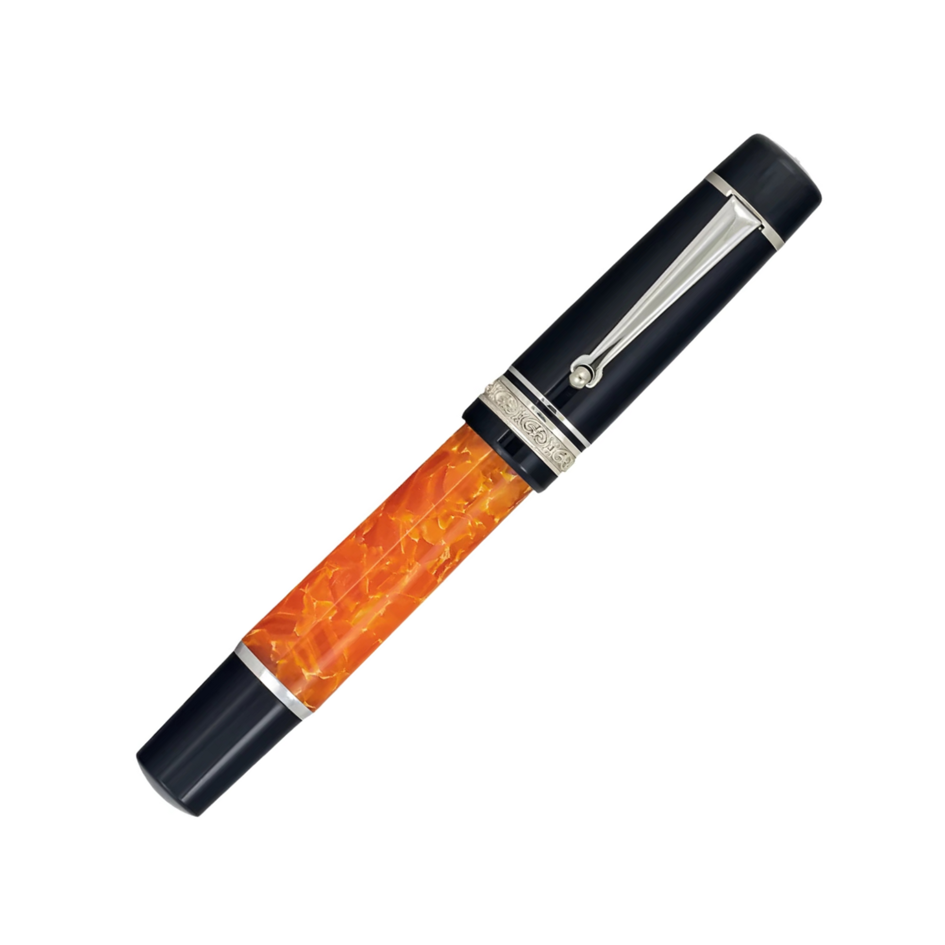 This classic Delta DV Original Oversize Rollerball has a commanding presence. It showcases the striking orange and black resin blend inspired by the original Dolce Vita design, complimented by 24k gold-plated trims. The vivid orange barrel provides a captivating contrast against the black resin cap and end. The design incorporates a threaded cap and meticulous detailing in the center ring, emblematic of Delta's meticulous and high-caliber craftsmanship, a hallmark of their design philosophy.