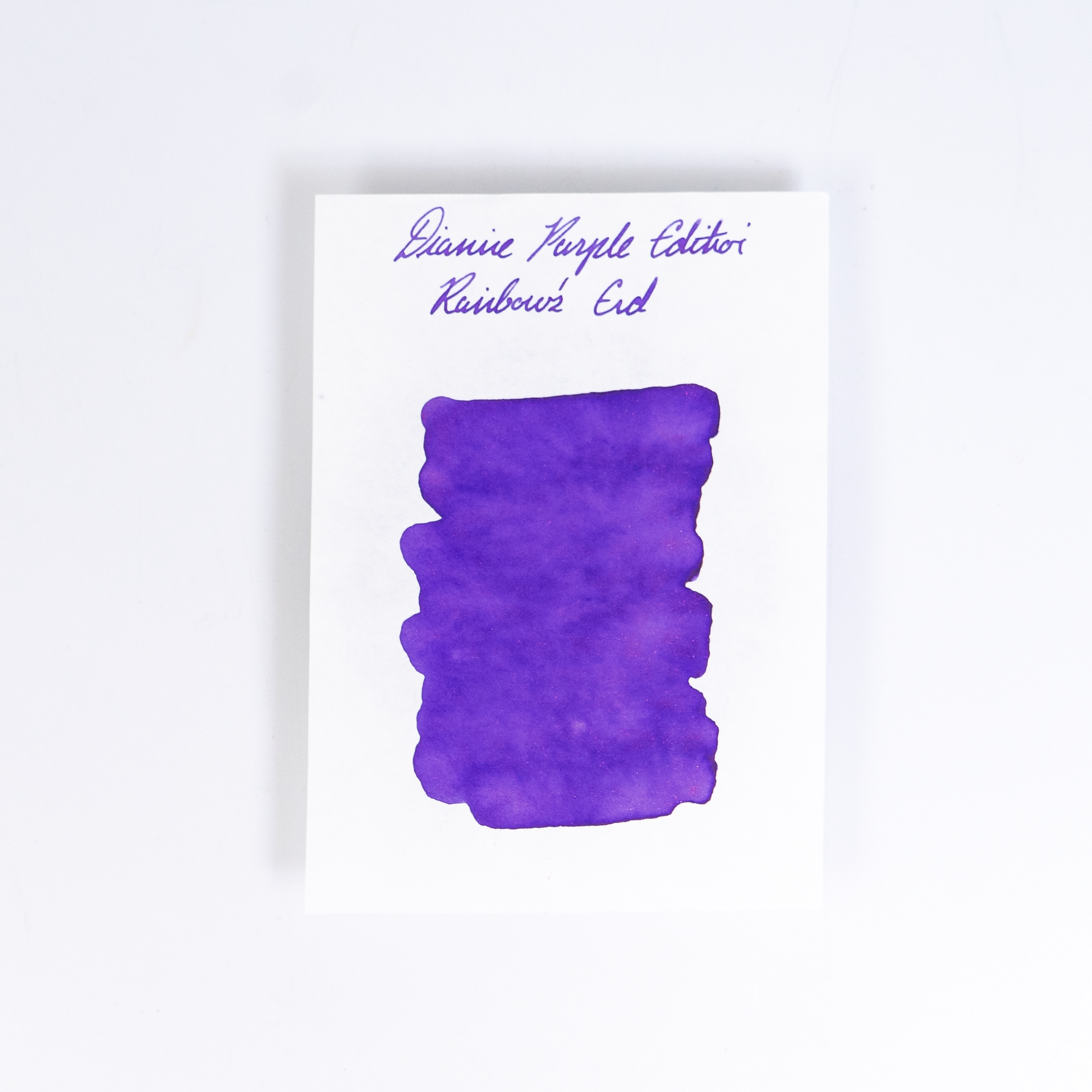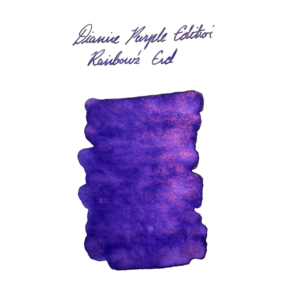 The Diamine Purple Edition Rainbows End Bottled Ink was originally released as part of their 2023 Inkvent Calendar of 25 inks. Contained in 50ml glass bottles this blurple fountain pen ink with pink shimmer is categorized as a Chameleon Ink.