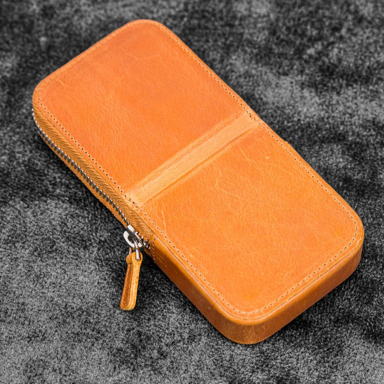 Transport your favorite pens safely without them getting damaged or scratched with our Handmade Crazy Horse Honey Ochre Zippered Magnum Opus 3 Slots Pen Case. This sturdy case features a removable tray that slides in and out effortlessly, providing you easy access to your pens. The removable tray also includes 3 individual pen slots lined with soft velvet material to prevent scratches. Whether you're carrying your pens in your in bag or luggage, you'll have the peace of mind knowing that your pens are well protected from bumps, knocks, scratches and damage with this leather case. Suitable for most fountain pens and other type of pens.