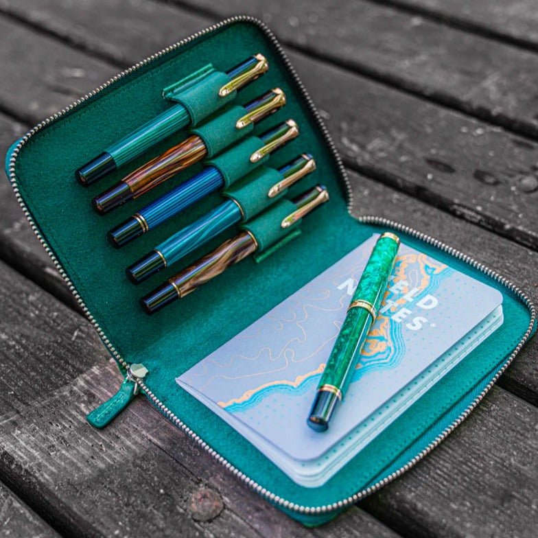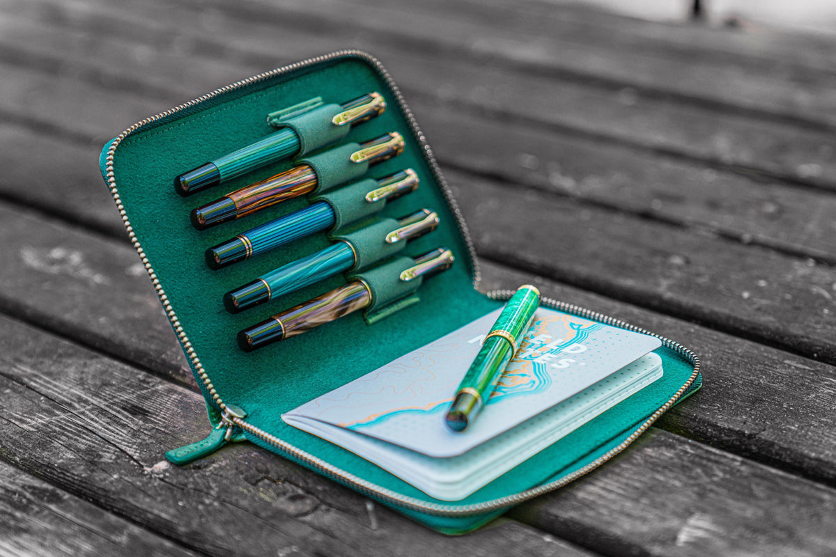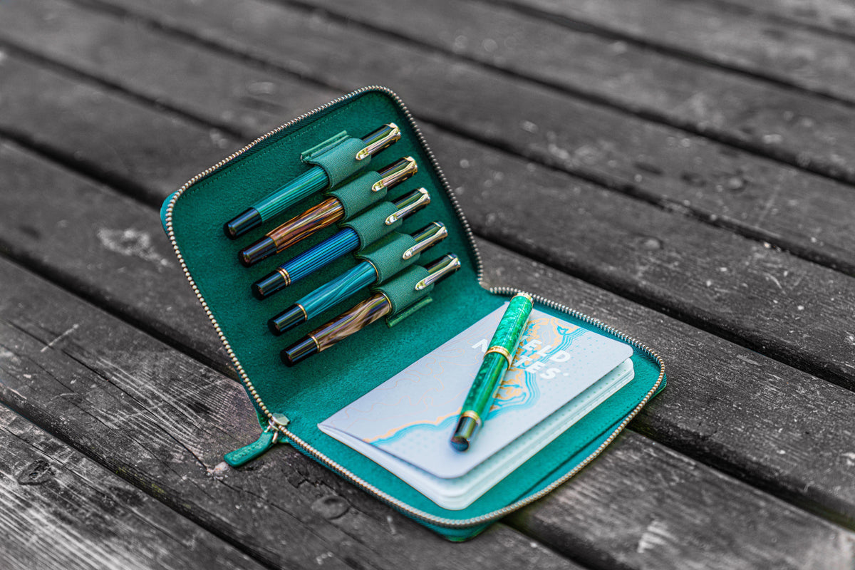 This Leather Zippered Pen Case in the new distressed Crazy Horse Forest Green color has a velvet lined interior and holds up to 5 pens. When you want to carry your favorite pens, you will want to protect them in your bag, purse or pocket to prevent the ink leaking everywhere or the pens getting scratched. This leather pen holder is great to protect your fountain pens and keep them safe.