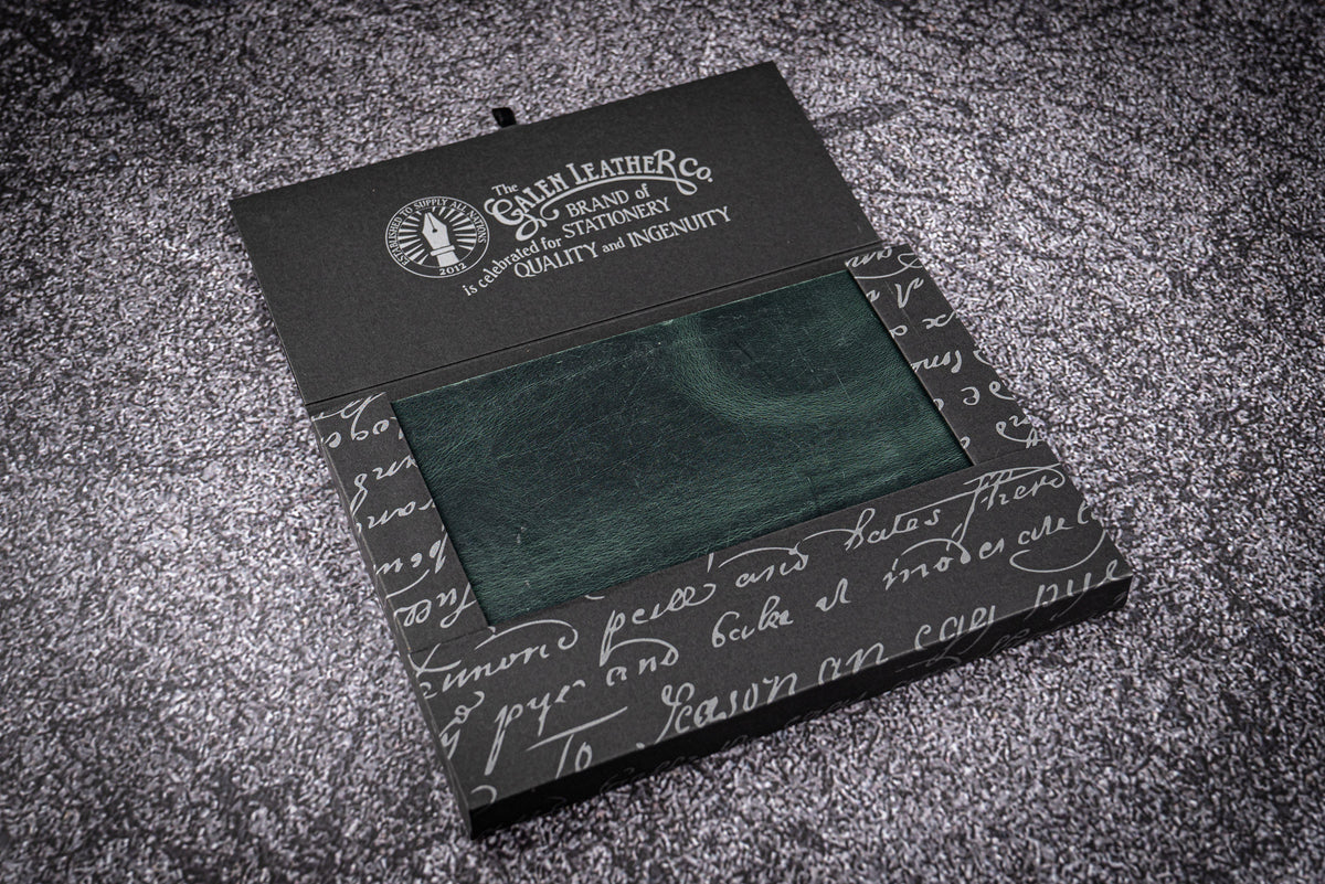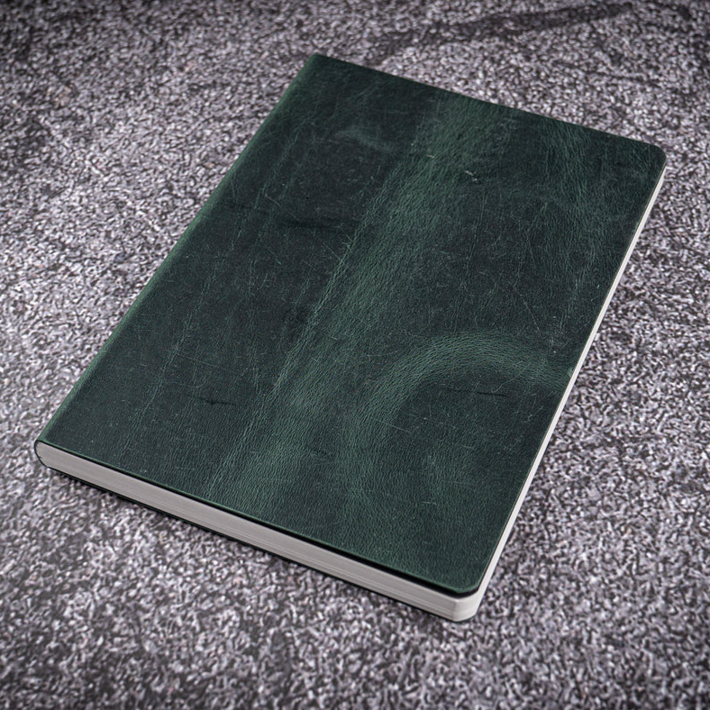 Our specially crafted A6 size notebooks are made of Tomoe River 52 gsm white paper, known as the best fountain pen-friendly paper. Each notebook contains 400 pages and is hand-bound with traditional bookbinding techniques. This notebook is available in two colors, the Crazy Horse Forest Green on this page, and in Crazy Horse Brown.