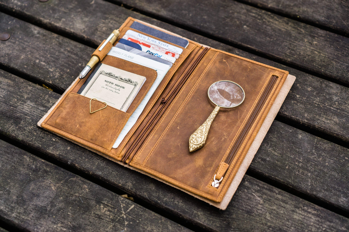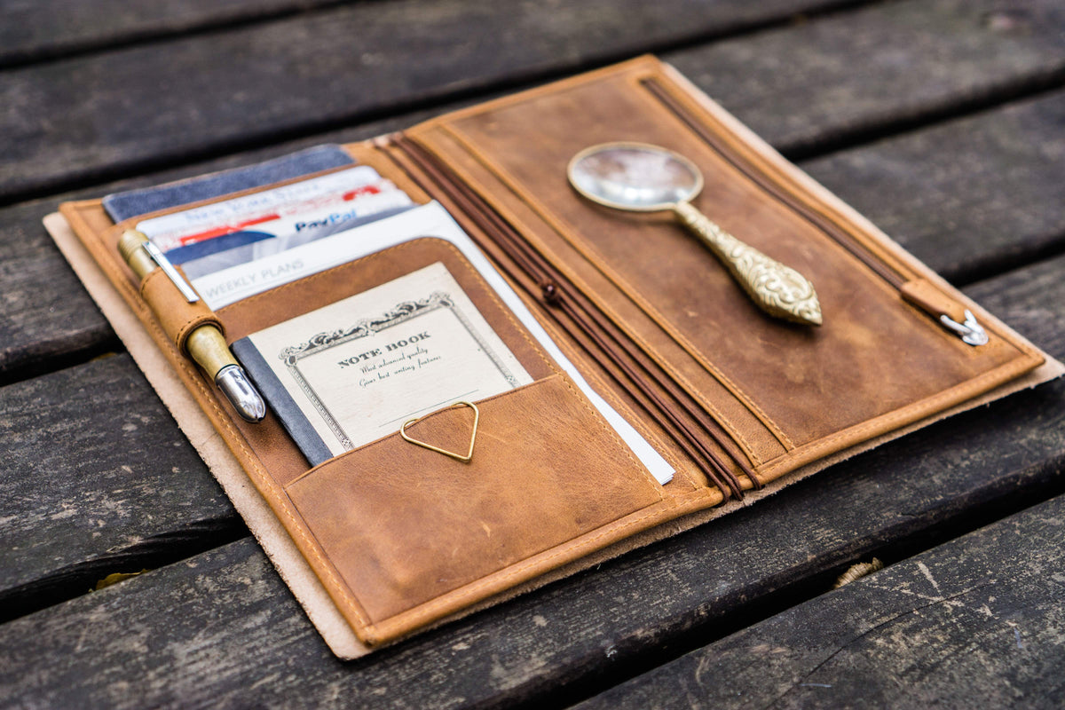 The left panel features 4 credit card size pockets, one pocket size notebook pocket, one long pocket, a small separator and wide pocket useful for small accessories, and one large pocket which is great for keeping your cash, receipt or a mobile phone (iPhone 7 plus fits easily).