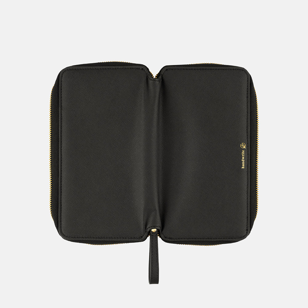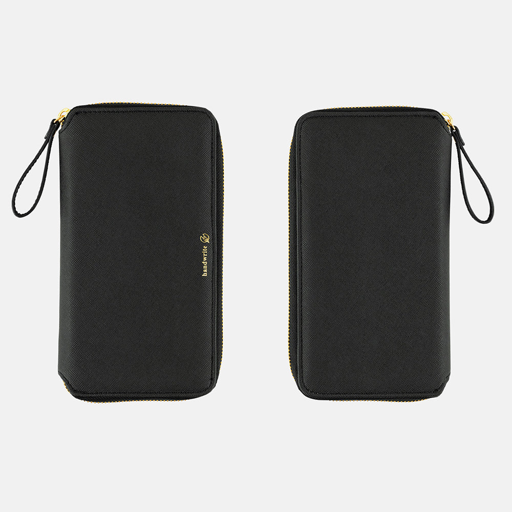 This cover fits a Hobonichi Techo Weeks book. This cover zips shut all the way around. Holds a pen inside by its clip. “Notte” is Italian for “Night.” The cover features a chic black color reminiscent of the night sky.