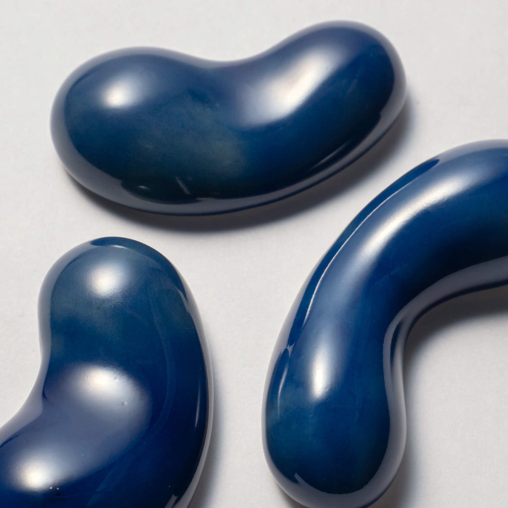 Porcelain clay and glazes, transformed by heat. The organic process results in pieces with unique imperfections from time to time. These Hasami pen rests in Ruri have uneven colouring or visible marks.