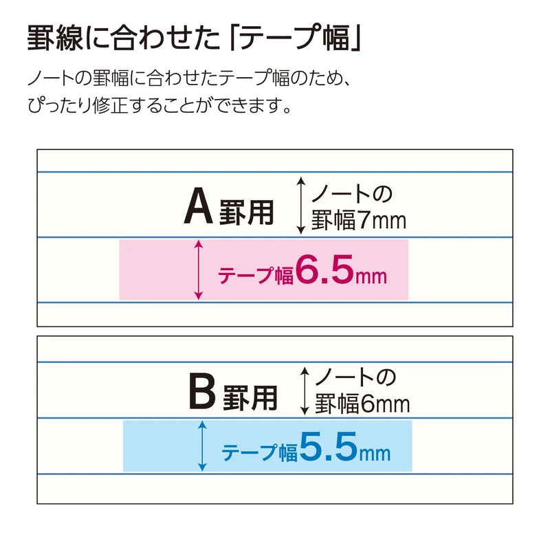 This 6.5 mm correction tape fits perfectly between the lines of 7 mm ruled KOKUYO Campus paper. For correcting 6 mm ruled paper, use the 5.5 mm correction tape. The tape runner features a limited-edition body design celebrating KOKUYO Campus's 50th anniversary.
