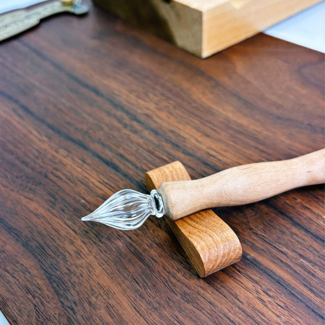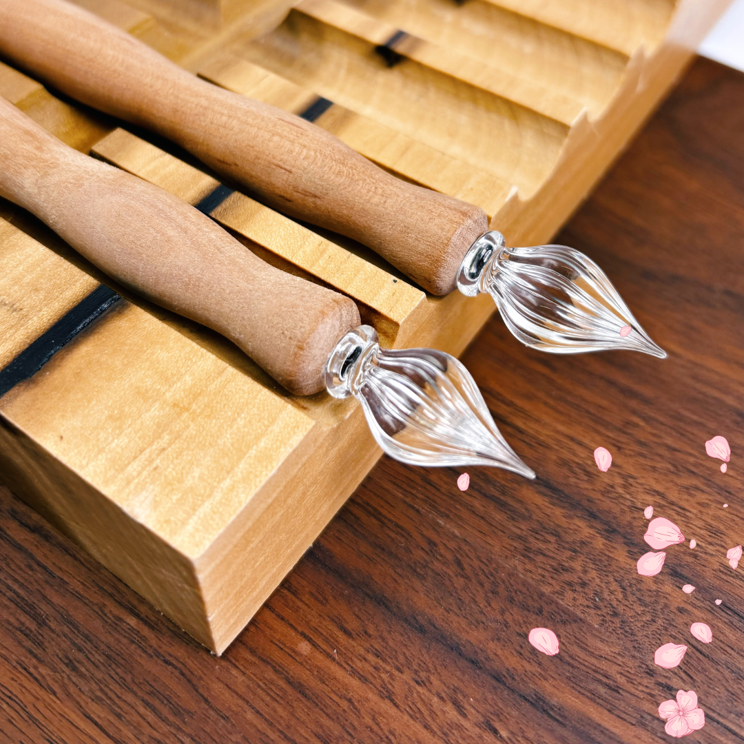 *Please note that because each glass pen is handmade, individual differences may exist. In addition, the color and design of the wooden shaft and pen rest will vary from item to item, since they are made from a natural material.