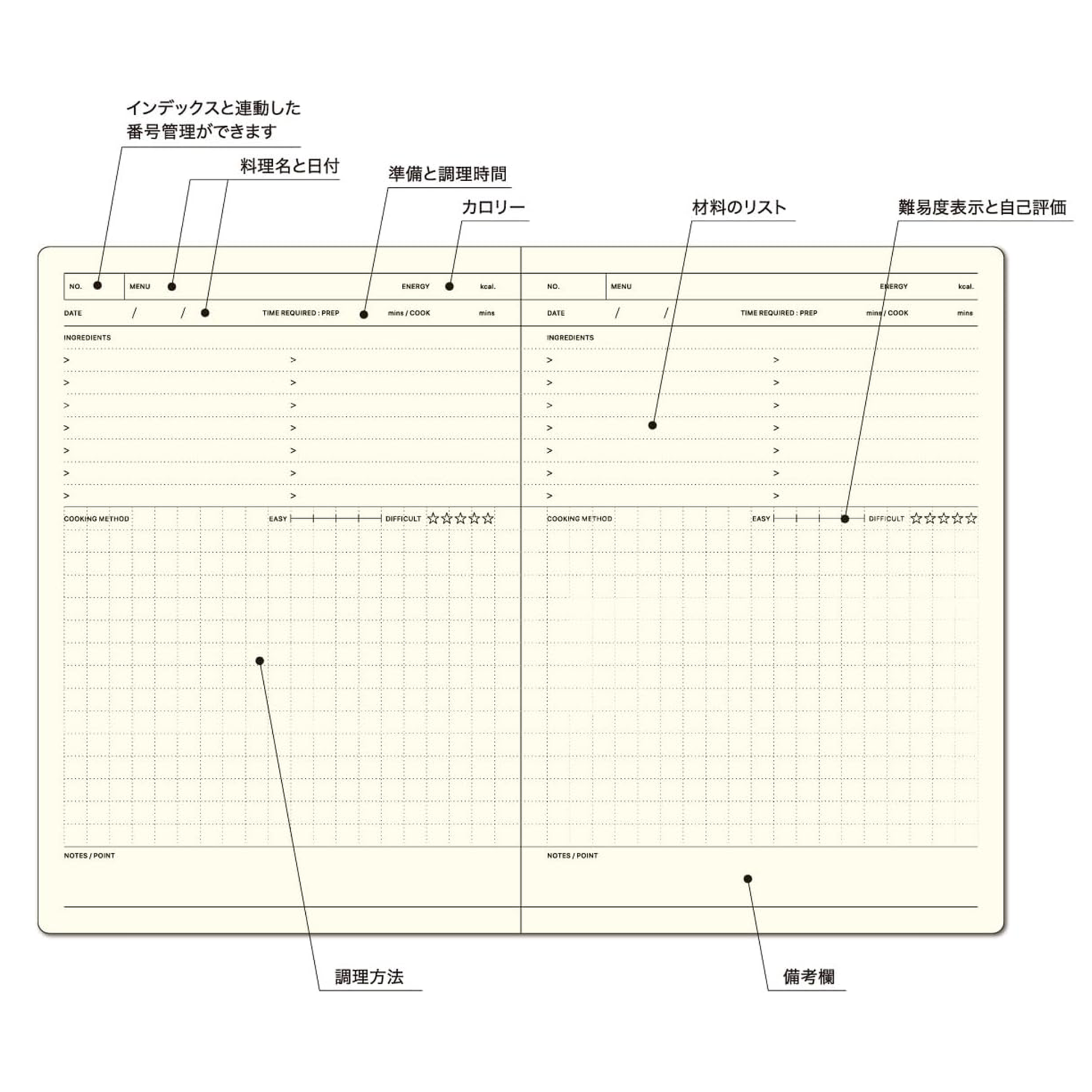 This notebook can record a total of 60 recipes. In addition to recording ingredients and cooking methods, you can create content that will be fun to look back on later, such as self-evaluation and difficulty level settings. In addition, each page is numbered and has an index linked to the page so that you can quickly find the recipe you want to make.