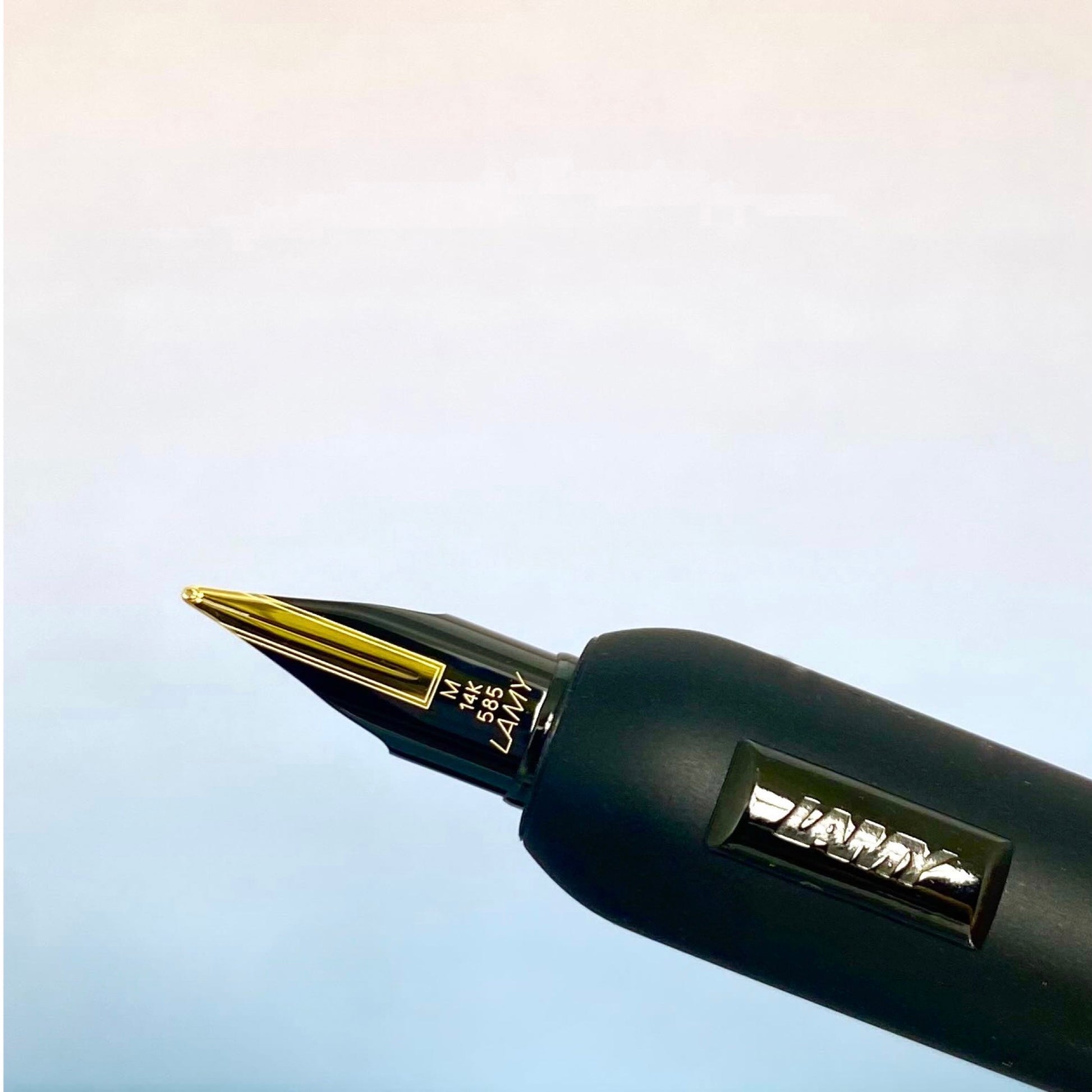 The LAMY dialog cc All Black Fountain Pen has a matte black finish with rose gold details and is available in Extra-Fine, Fine, Medium and Broad nibs.