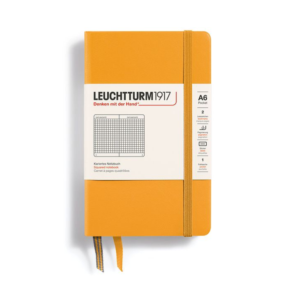 • The Leuchtturm1917 Rising Sun Hardcover Pocket (A6) Notebook features a hard cover in a handy A6 format with 185 pages, measuring 90 x 150 mm, is an exceedingly practical size for keeping by your side at all times. Always at hand, the Pocket format with its hard cover is the ideal companion for making notes when the best thoughts occur while on the go in a handy size which will fit in any bag, jacket or trouser pocket.