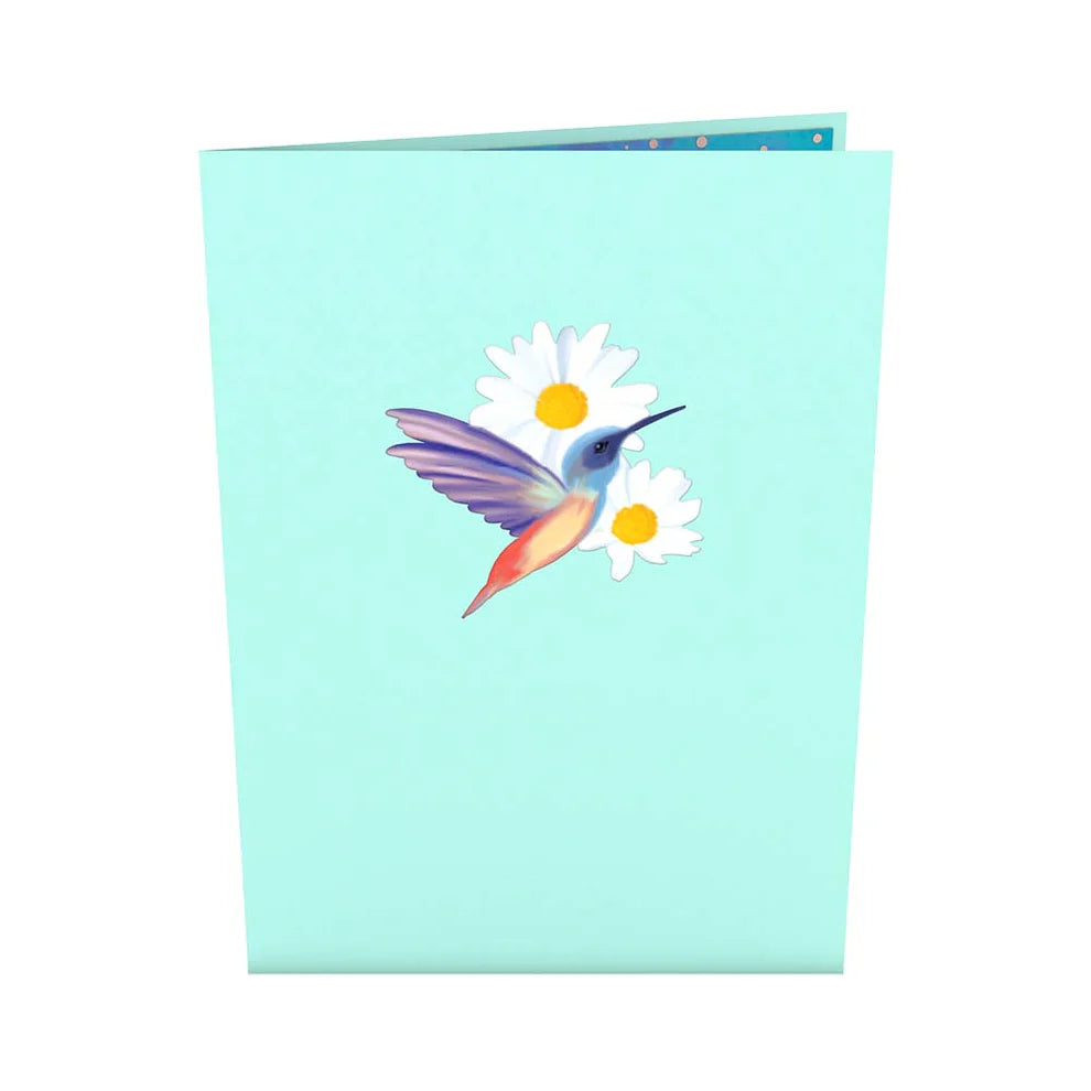 Let yourself be drawn in by this pop-up card's colorful exterior, with a bright turquoise background and a brilliant hummingbird flitting over a patch of daisies. Similarly, vibrant hummingbirds dance across a collection of delicate daisies when the card opens, producing a 3D effect that brings the greeting card to life. The daisies and hummingbirds sit on a cool blue background, which makes it appear as if the birds are perching in the clouds.