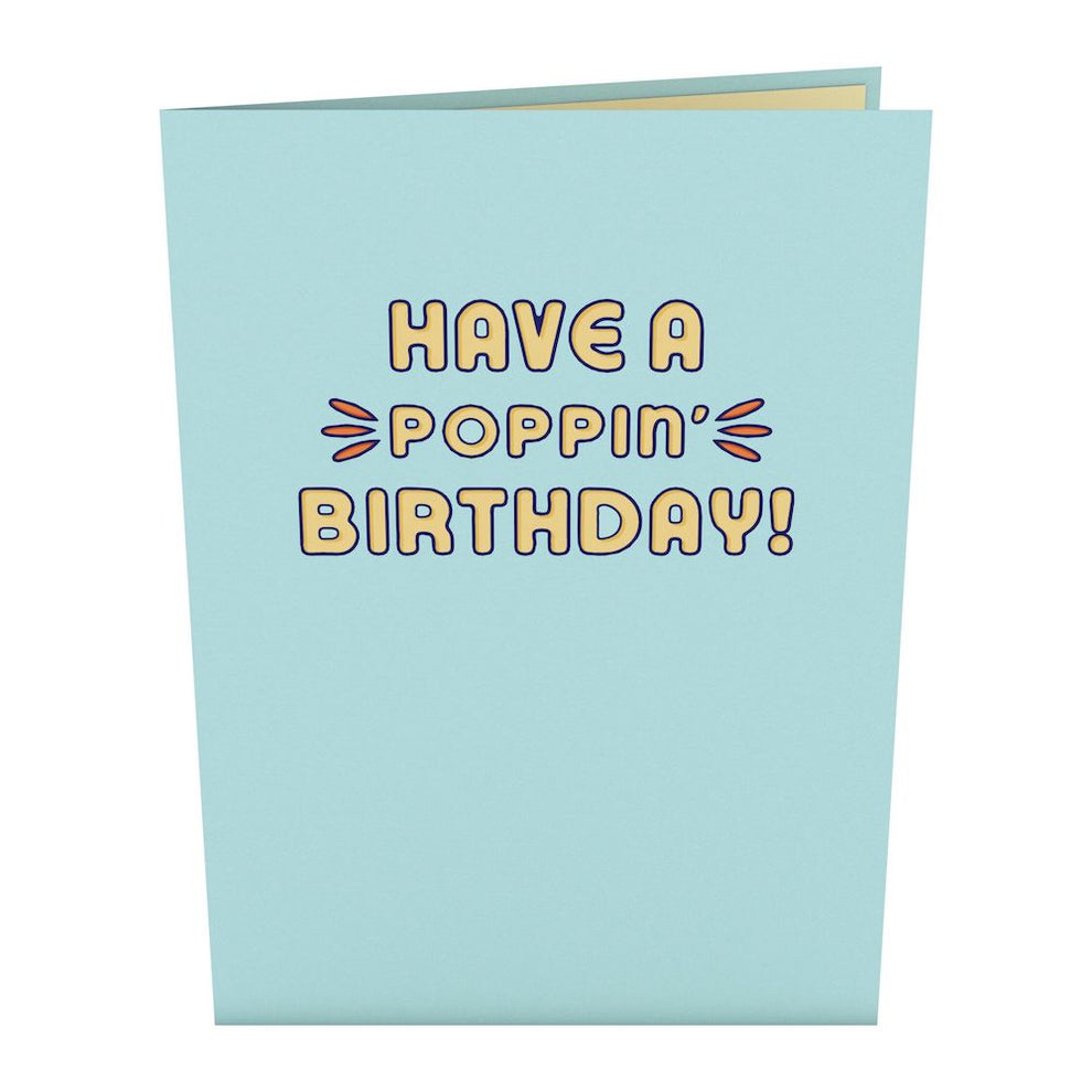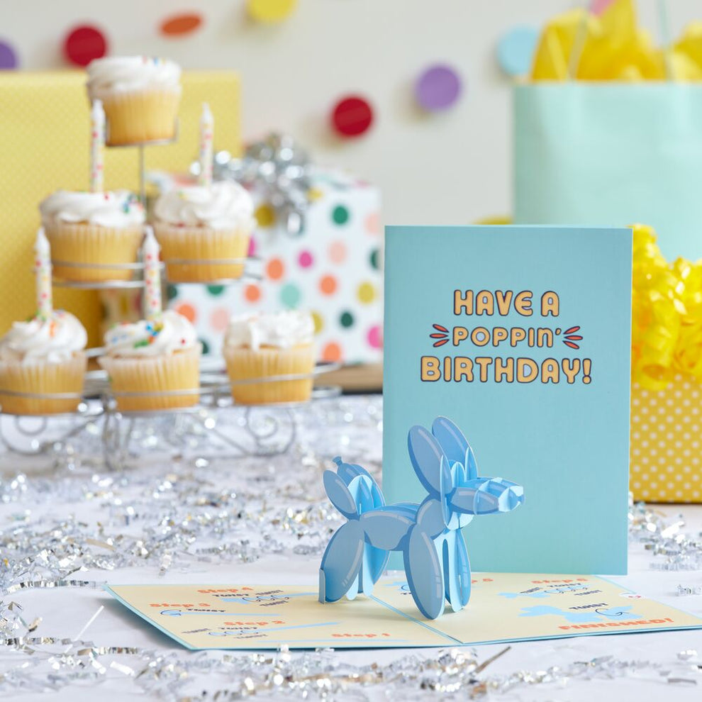 The front cover of this pop-up card is pale blue with the message 'Have a poppin' birthday!' in yellow bubble lettering. Inside the card, a 3D dog made of balloons jumps up to say hello. The dog features different shades of blue and details that make the balloons appear shiny and ready for a celebration. On the light yellow inside cover, there are detailed illustrations and steps that provide a tutorial on how to create your own puppy friend out of balloons.