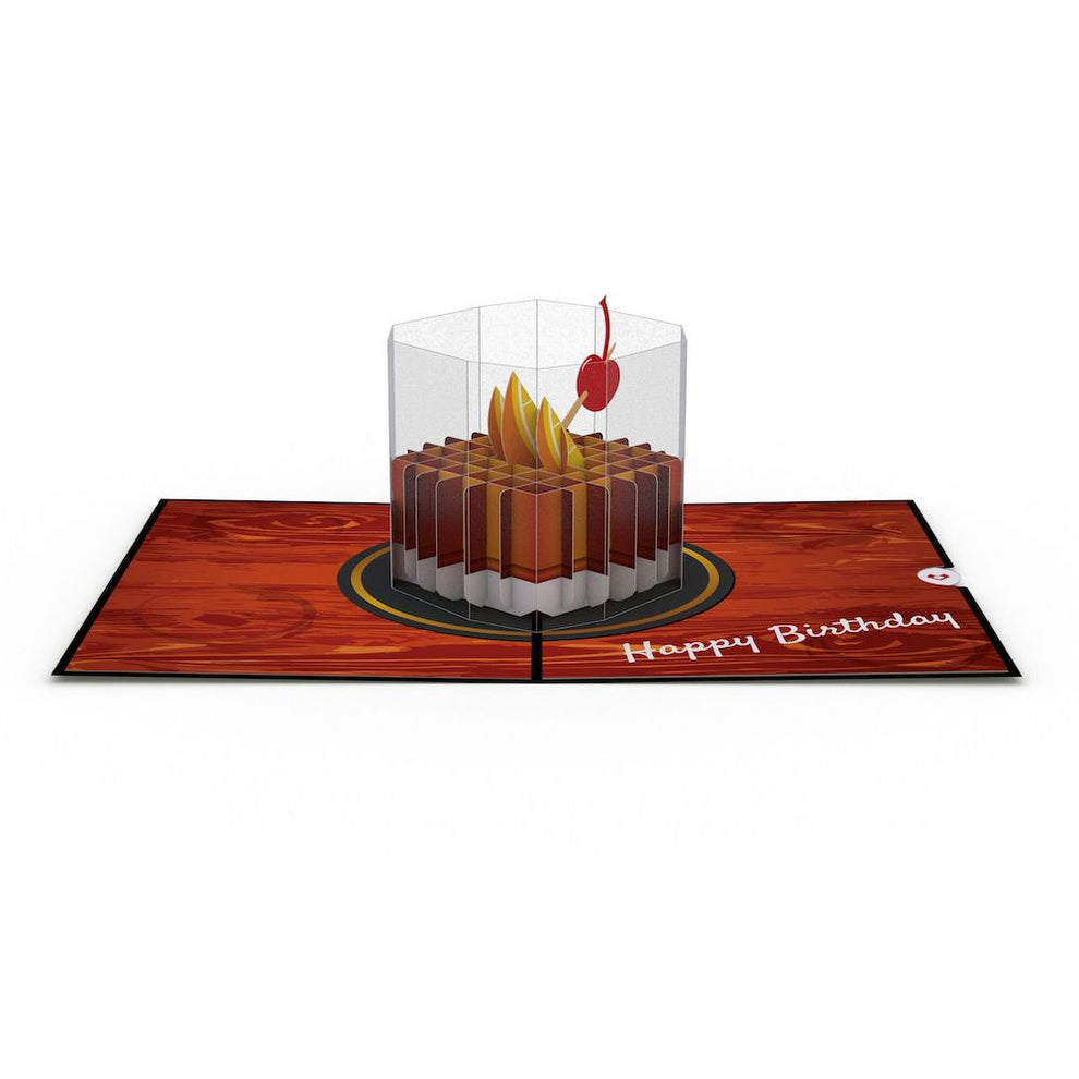 On the cover of this black greeting card, you'll find the words 'Celebrate! The Old Fashioned Way' in white, vintage script. A toothpick spearing a maraschino cherry and orange slice adorns the letters. Inside, a paper sculpture of an old fashioned cocktail pops out, complete with a fruit garnish in a lowball glass. The drink sits on a coaster in the background, which imitates a wooden table complete with a 'Happy Birthday' message in white cursive.