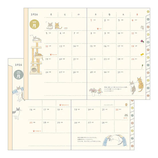 The theme for 2026 is "The Cats of the Koizumi Household," featuring soft, charming cat illustrations and columns by the illustrator, Sayo Koizumi. This diary captures the everyday lives of the Koizumi family’s four unique cats. At the end of the diary, there's a special column titled "A New Kitten Has Arrived!" which was written during the creation of the 2026 illustrations, reflecting the arrival of their new kitten.