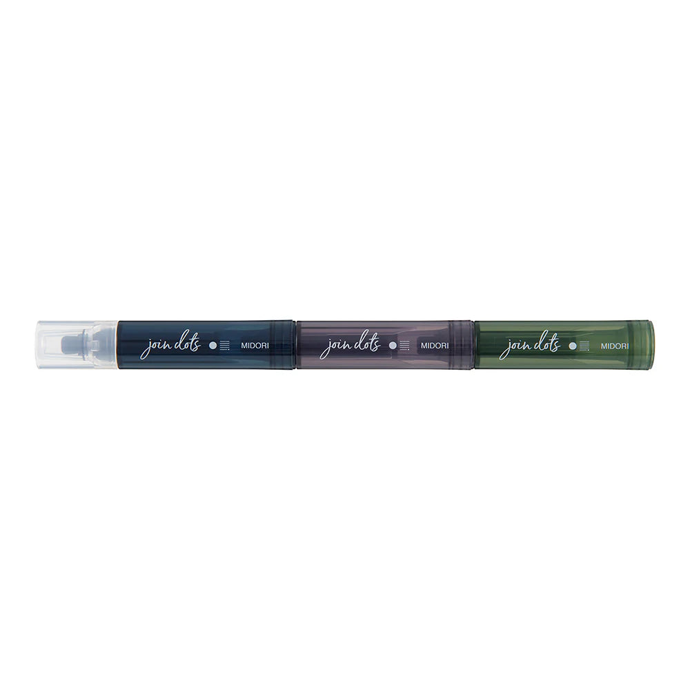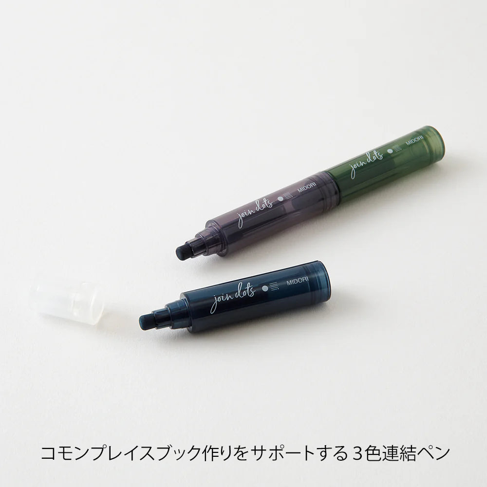 Midori's Join Dot is a 3-color linked marker inspired by the Commonplace Books system of color-coding your notebook. The circular nib allows you to easily press dotes onto your notes. By adjusting the angle, you can also apply thick or thin lines.