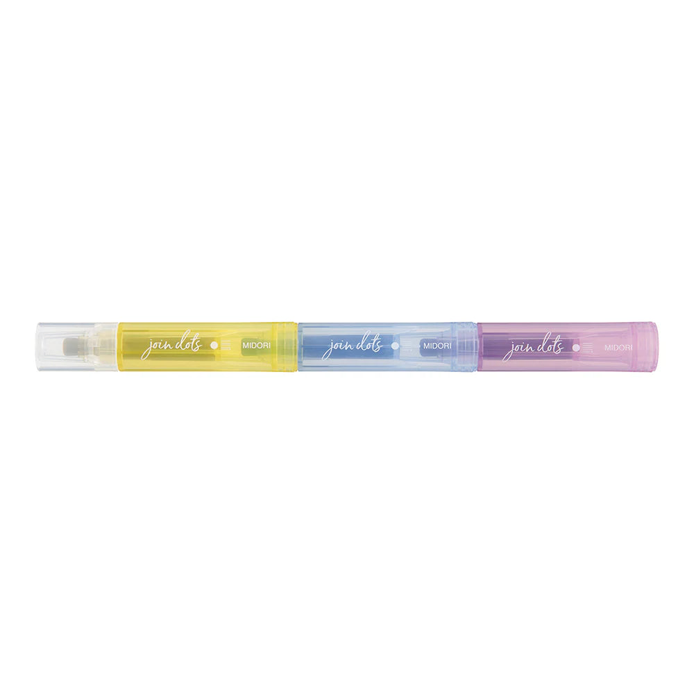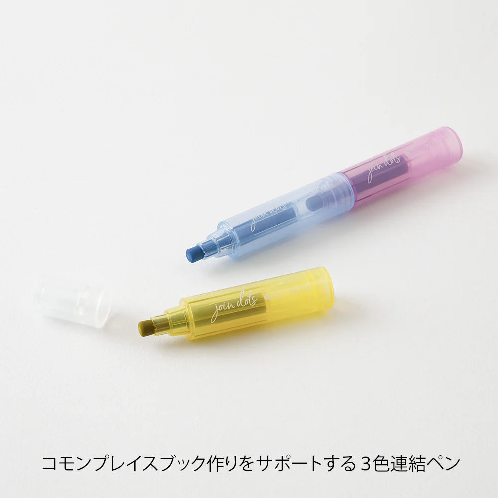 Midori's Join Dot is a 3-color linked marker inspired by the Commonplace Books system of color-coding your notebook. The circular nib allows you to easily press dotes onto your notes. By adjusting the angle, you can also apply thick or thin lines.