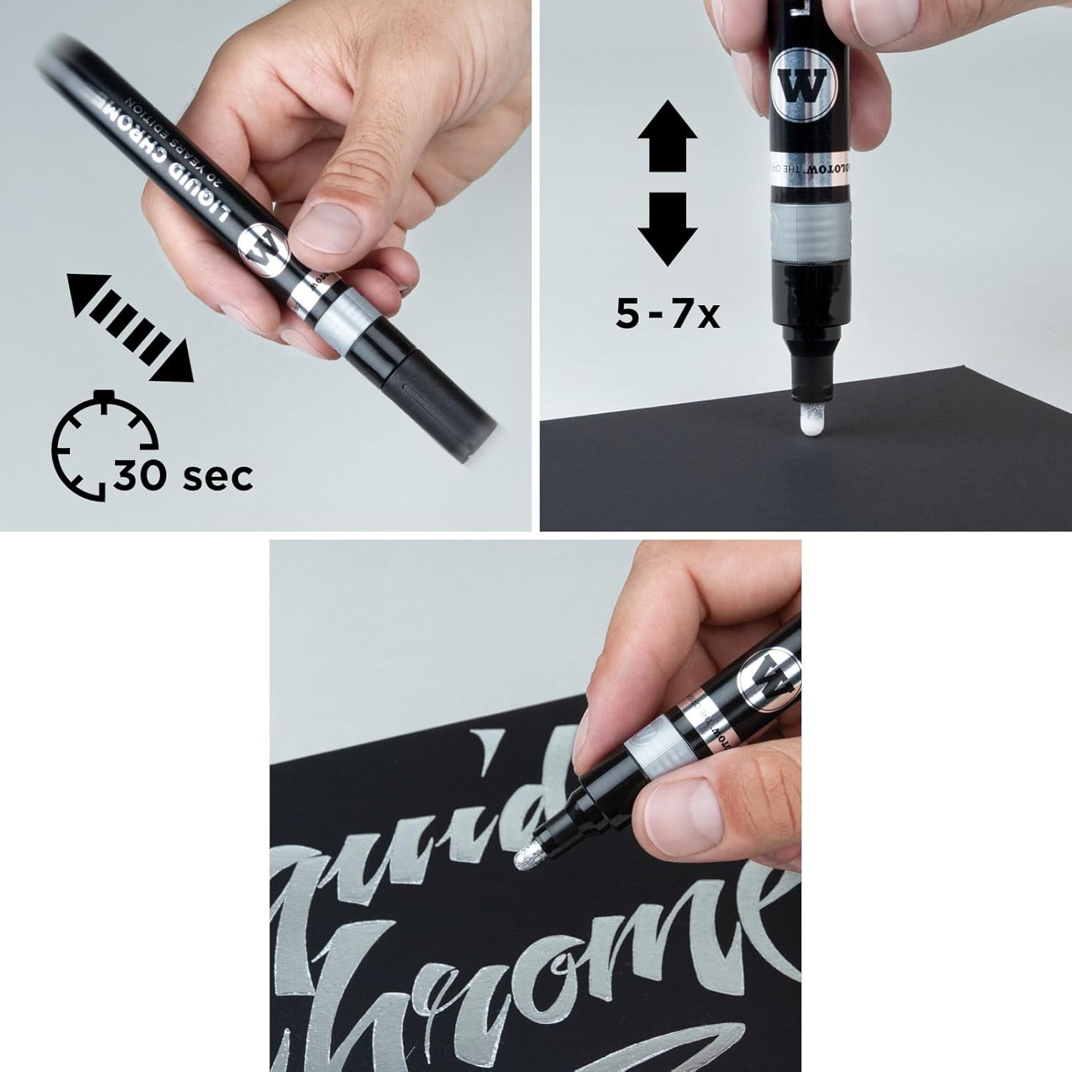 The first marker whose special ink looks like liquid chrome. The highly pigmented ink creates a mirror effect and is perfect for the graffiti, hobby and D.I.Y scene