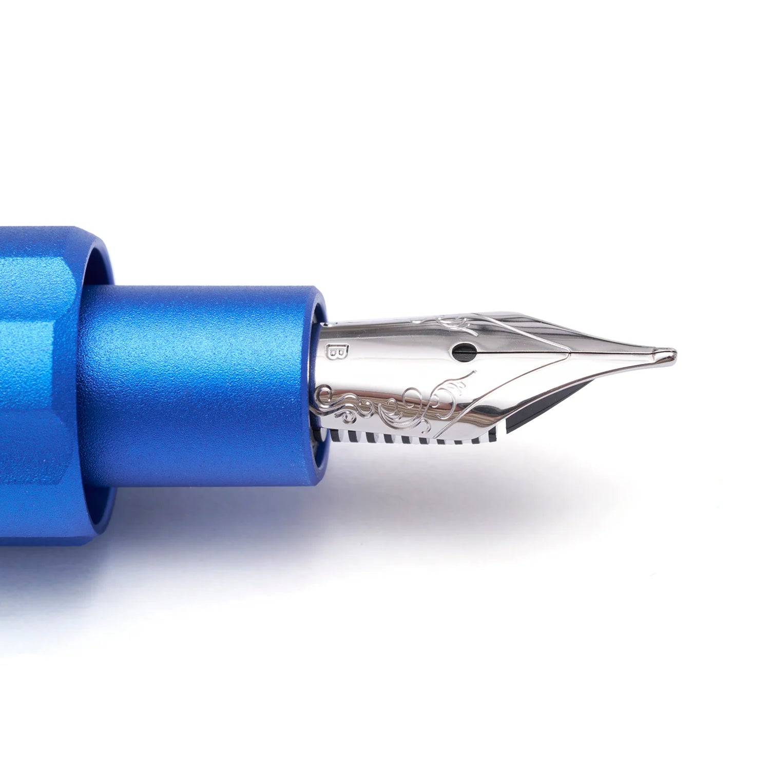 The Axis is made of matte blue anodized aluminum and is lightweight and comfortable in hand, and available with a JoWo #5 nib in a variety of nib sizes. The Axis fills via a mini converter, and has a magnetic cap.