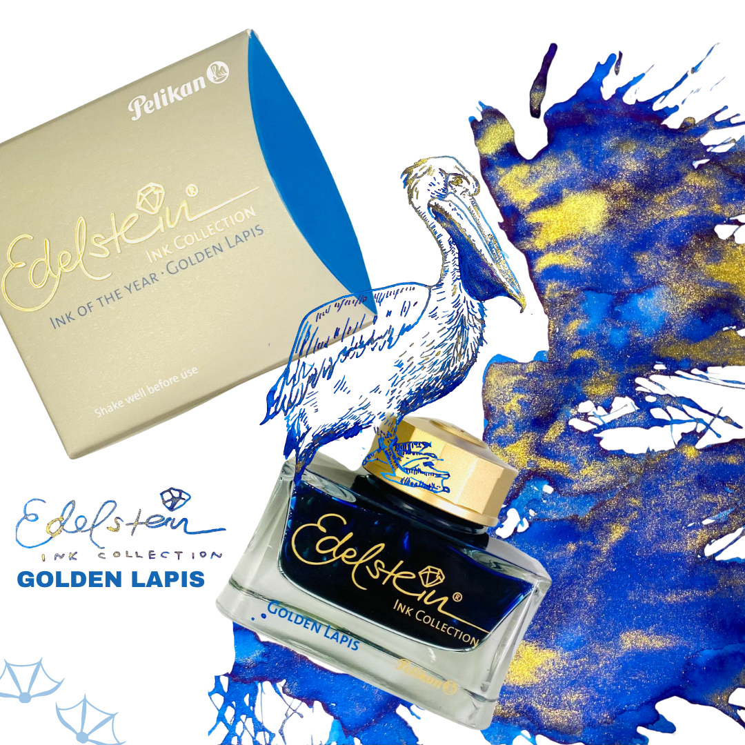 As part of its own DNA, Pelikan has been an expert in the development of high-quality ink formulations for over 185 years. The Edelstein Ink Collection is a special ink development. Pelikan has set a high standard with this extraordinary ink collection. The noble bottle is based on the design of a perfume bottle and stands for itself as a high-quality icon. Filled with the gemstone ink, which is inspired in its color variety from the world of gemstones, offers on the one hand very appealing writing colors and in addition also a particularly soft writing feel due to a special additive in the formula. So your thoughts fly very softly on the paper. The Edelstein ink of the year is an enchanting color combination of a vibrant blue tone refined with a golden shimmer. The Golden Lapis gemstone was once considered a jewel for kings and was associated with strength, wisdom and protection from negative influences. To this day, golden lapis is also a symbol of inner peace and emotional balance. This balance of a powerful and calming color effect gives the handwriting a special expressiveness. The golden shimmering elements in the ink flow randomly, giving the writing ever-changing expressions of color.