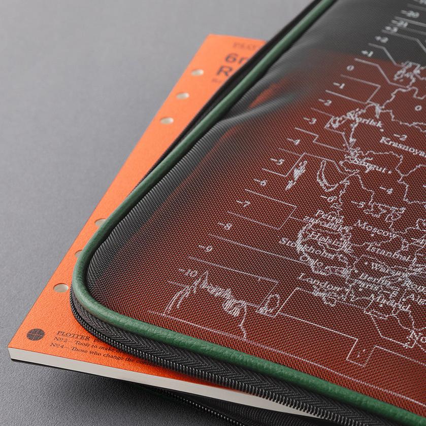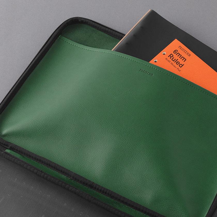 Synthetic leather is used for the back and interior for practicality, lightness, and strength. The slim and stylish mesh case can be used as a bag-in-bag or on its own. This is a convenient case for storing PLOTTER Leather Binders, extra Refill Memo Pads, pens, and any other accessories you want to hold together. The color of this A4 Mesh Zipper Case is in a stylish green.