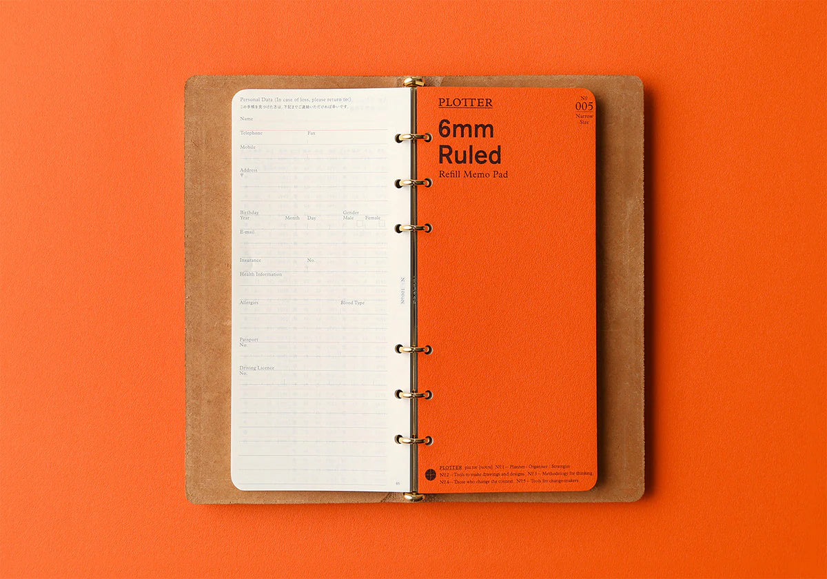 Note: The backplate is made of brass and plated with gold color. Plating may come off due to friction and will exhibit the natural oxidation and discoloration of the brass material. Please enjoy the natural aging of the brass characteristic alongside the leather. We recommend inserting no more than 80 pages of PLOTTER original DP refill paper to ensure the longevity and functionality of the hardware.