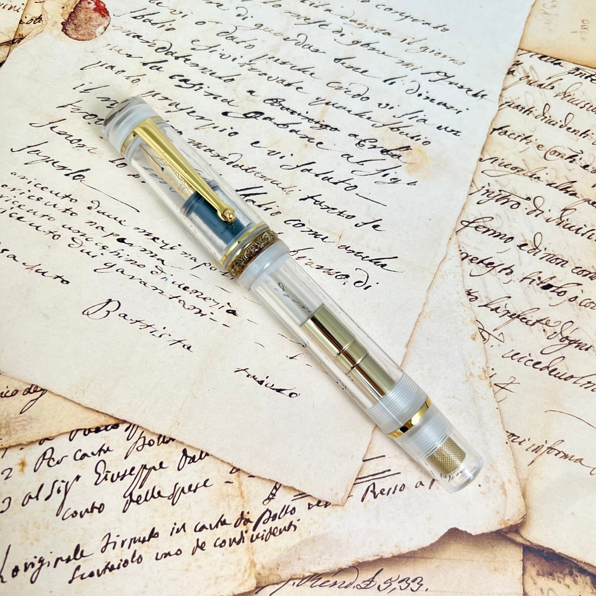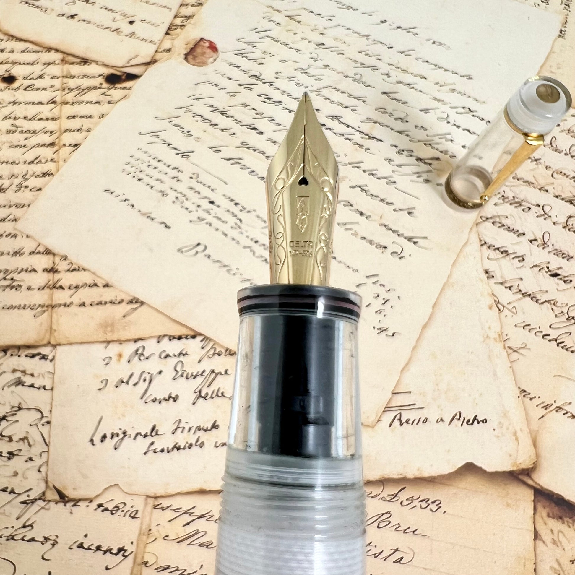 Elevate your writing experience with the Pre-Owned Delta Dolce Vita Fountain Pen! Its eye-catching design and demonstrator feature allow you to see the inner workings of the pen. Its large size and piston fill feature ensure a smooth and effortless writing experience, while the 14K gold nib adds a touch of luxury. Upgrade your pen game today!