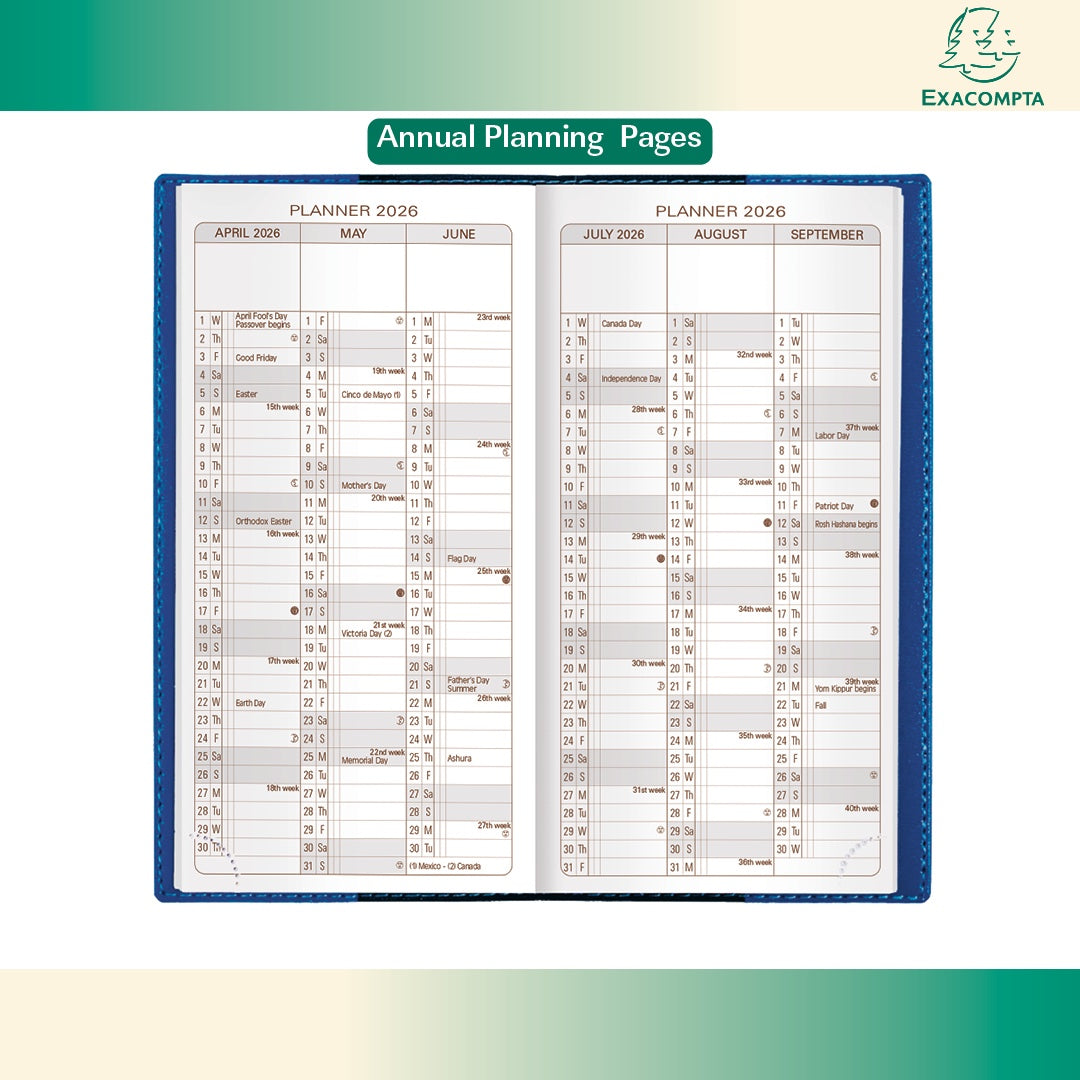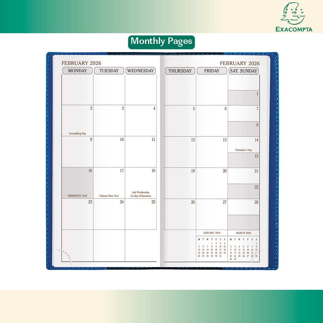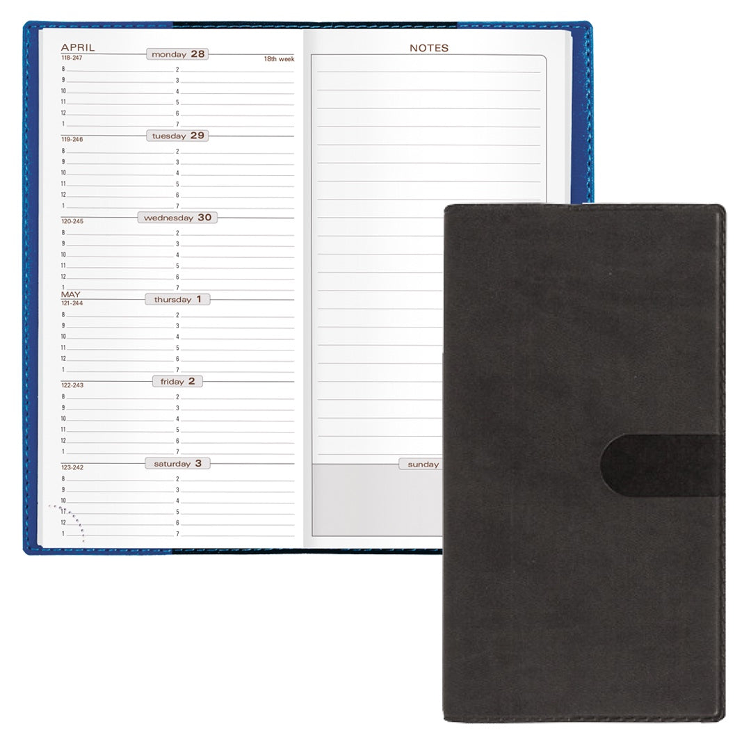This pocket-sized planner includes 12 months from January to December. This unique weekly layout has everything in one book: weekly schedule on the left and notes page on the right. Features 64g of Clairefontaine white paper an attached address book. Refillable. Choose from a variety of covers and colors.