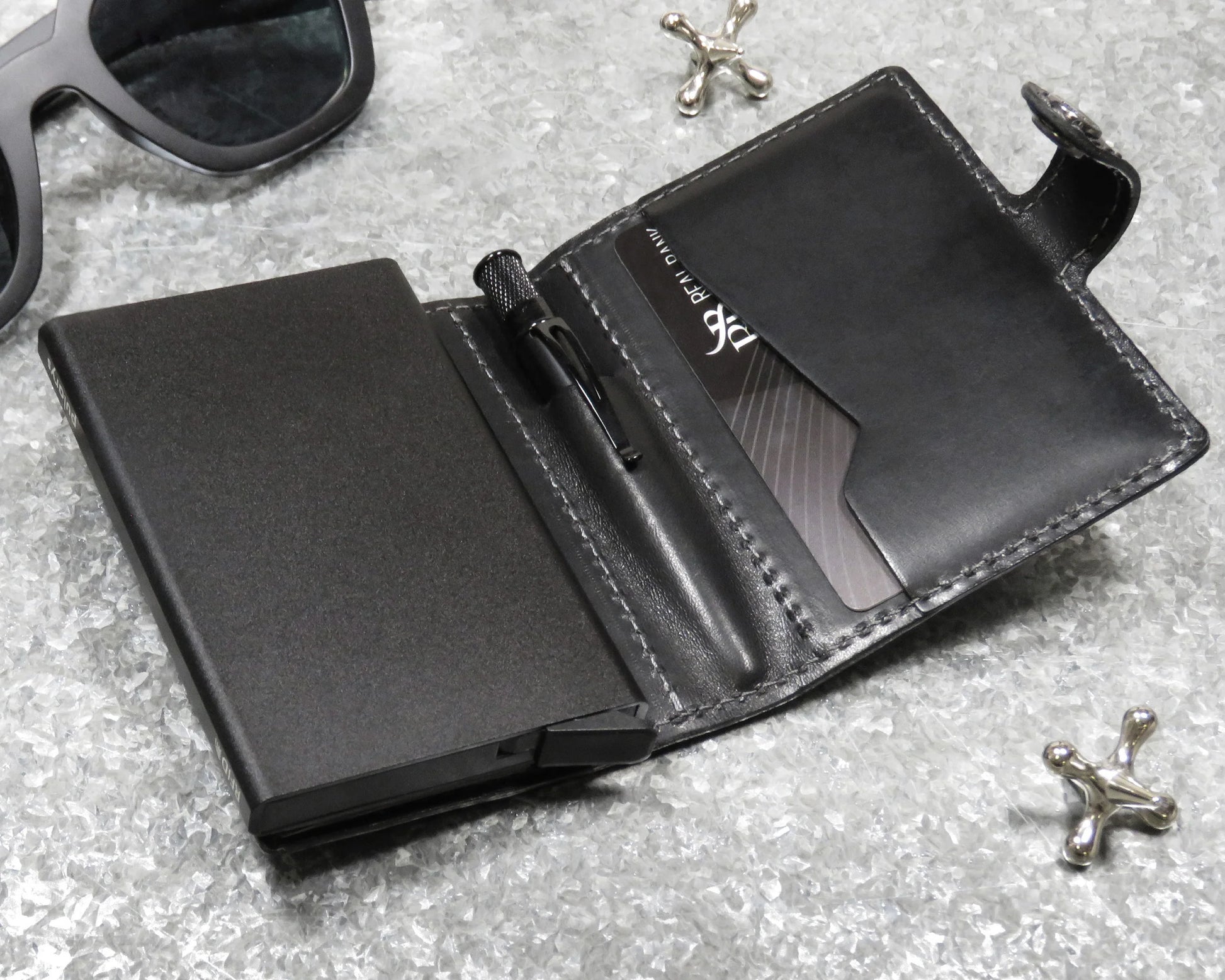 The Modern Traveler is manufactured by our friends Pularys using genuine leather, their aluminum case with RFID protection and quick card release lever, plus an Elite Tornado in a complimentary color.