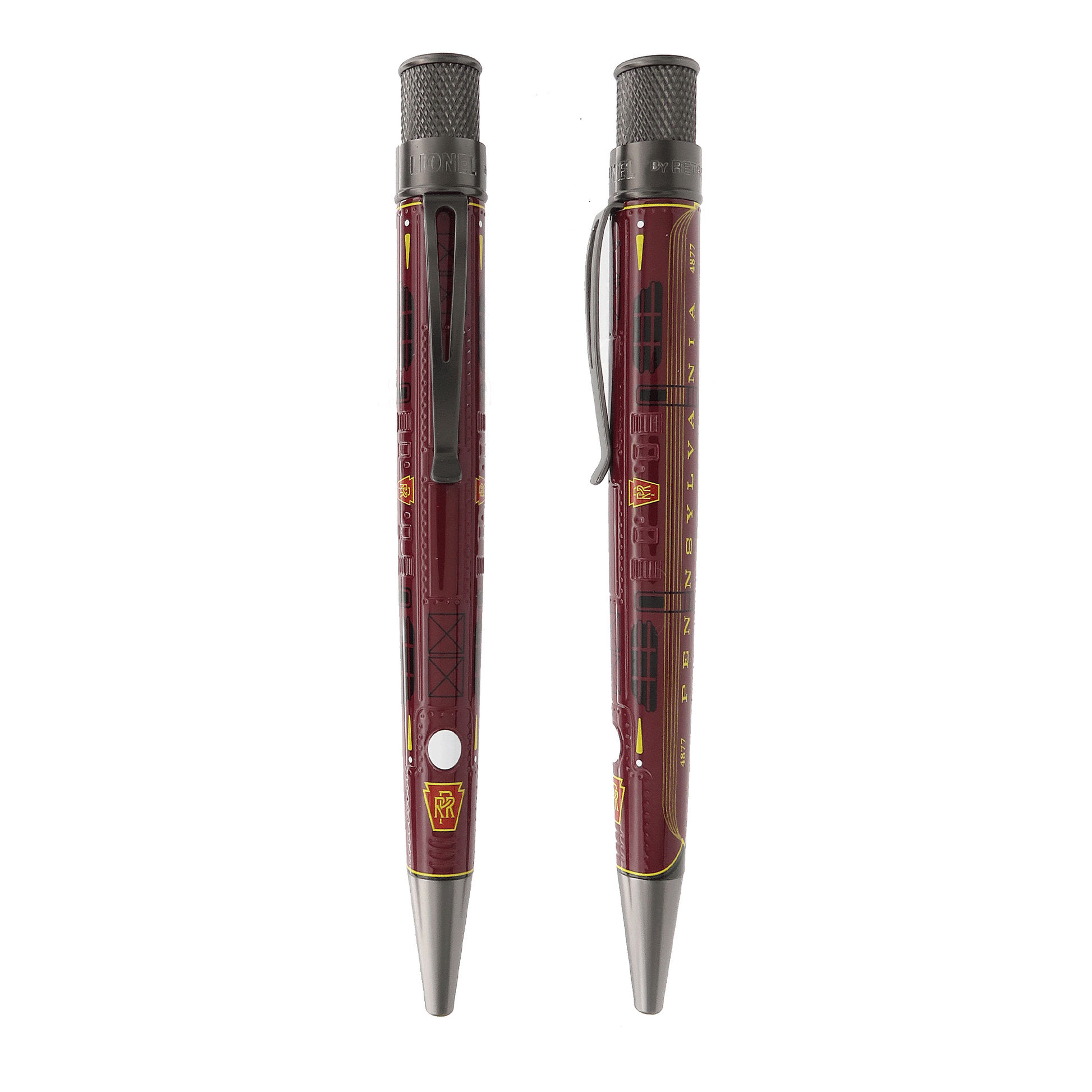 The pen mirrors the 4877 in stunning detail: acid-etched rivets and vents, maroon and gold striped paint, the iconic PRR logo, matte black nickel accents, and a Lionel-engraved top ring with logoed disc. Every curve and contour evokes the power and elegance of this historic locomotive.