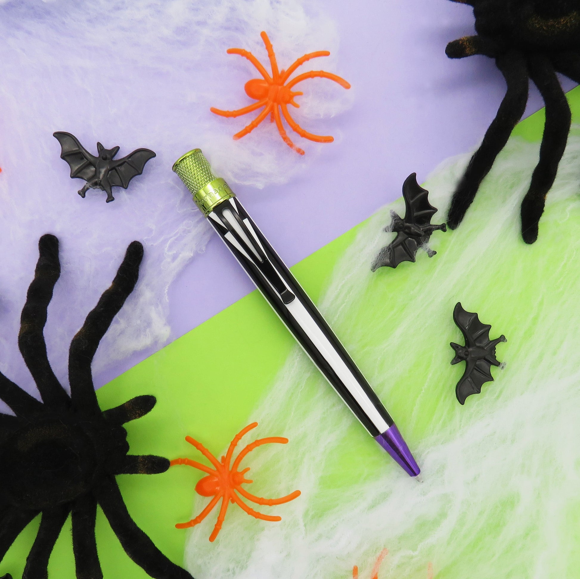 Are you strange and unusual? Then the Limited Edition Retro51 Tornado “Showtime” is the pen for you! Wrapped in bold black-and-white stripes, this pen is dressed to impress with a clip that doubles as a tie, making this design classic and creepy. The ghoulish chrome-green knurl top and eerie purple nose cone add just the right amount of afterlife flair.