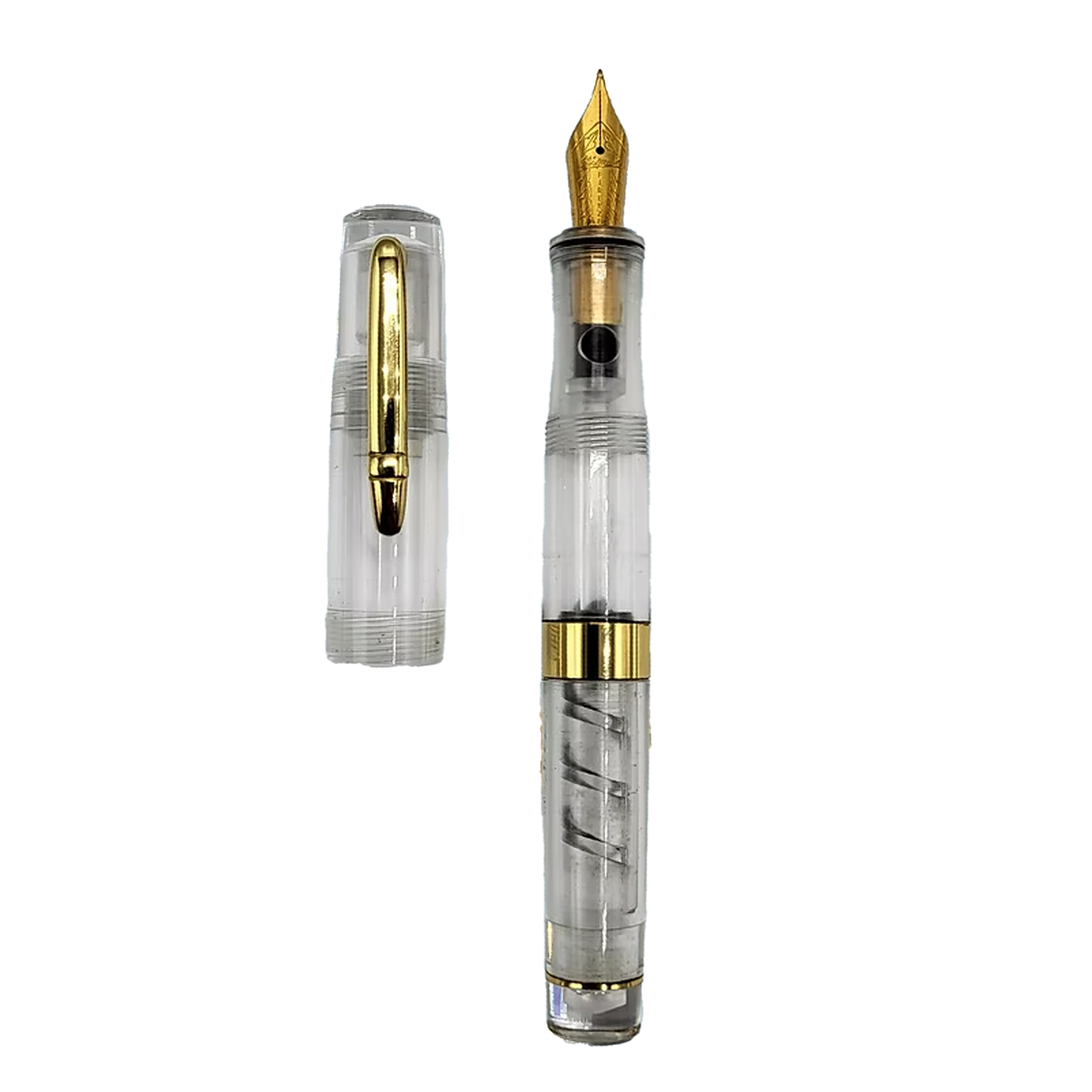 A great advantage of the twentieth century in the Nude Muzzleloader, borrowed from the tradition ofsafety pen, is that the ebonite feed is constantly immersed in a real ink bath. This enhances the freshness and generosity of the line even with the most demanding nib tips. The crystalline transparency of the tank combined with the gold details then creates an effect of absolute purity.