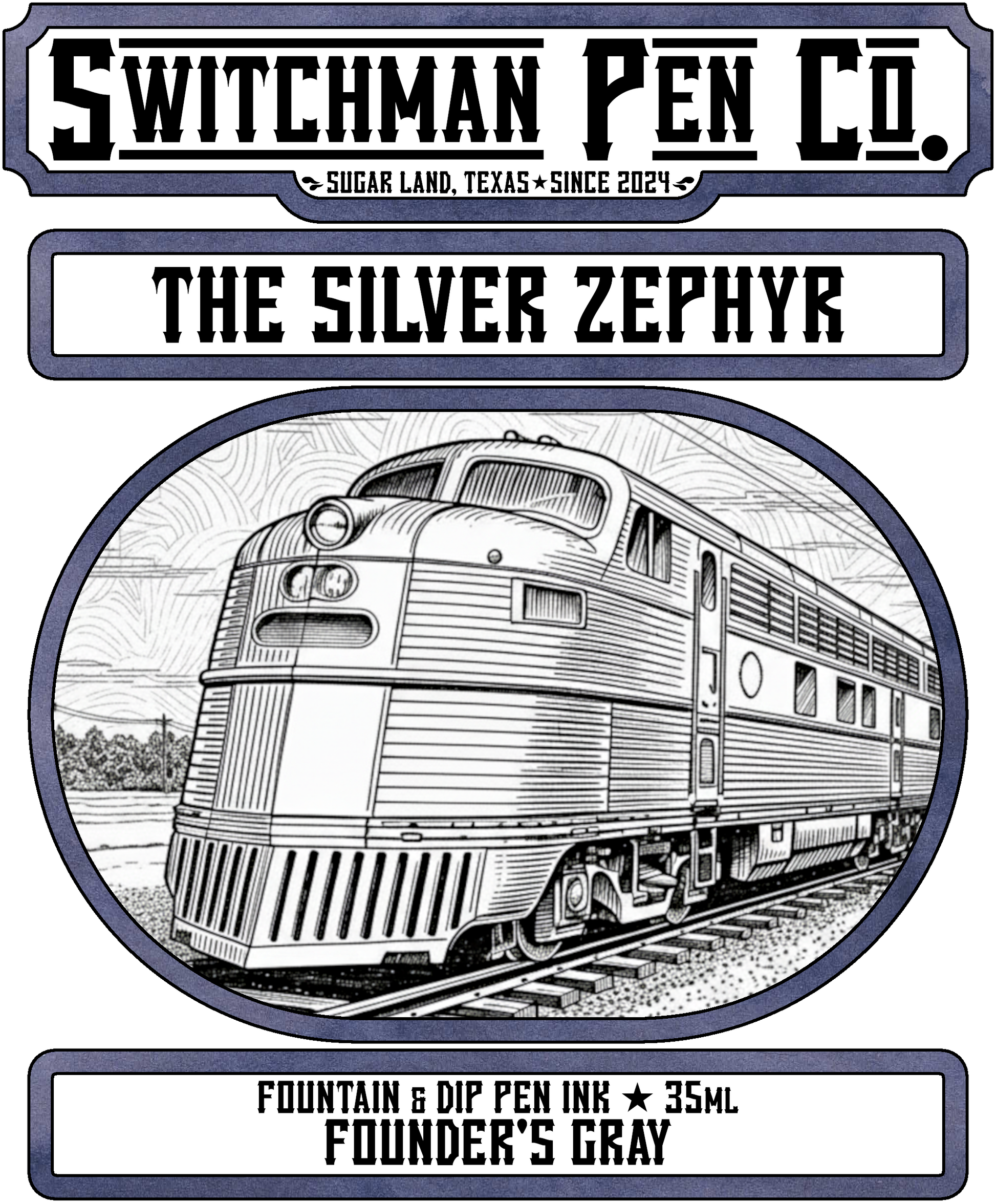 Few trains are as iconically American as the streamlined Zephyrs of the American midwest. From the Pioneer Zephyr which began its runs in 1934 to the 1971 termination of service for the Nebraska Zephyr, these silver trains were THE vision of America's rails and were featured in films and television, in advertisements and fiction. The Silver Zephyr, or Founder's Gray, is Switchman's ode to these trains and to its honorary founder, John Ferdinand McGhee II (grandfather and great-grandfather to Switchman's founders), who worked for as a switchman on the famed Milwaukee Road just north of the Chicago-based CB&Q Railway (or "The Burlington") which operated the Zephyrs. The roiling blue-gray hues hinted with purple give Founder's Gray the look of storm clouds reflected in the silver skins of those iconic trains as they coursed their route from Chicago to Omaha and back again through the windswept midwestern plains.