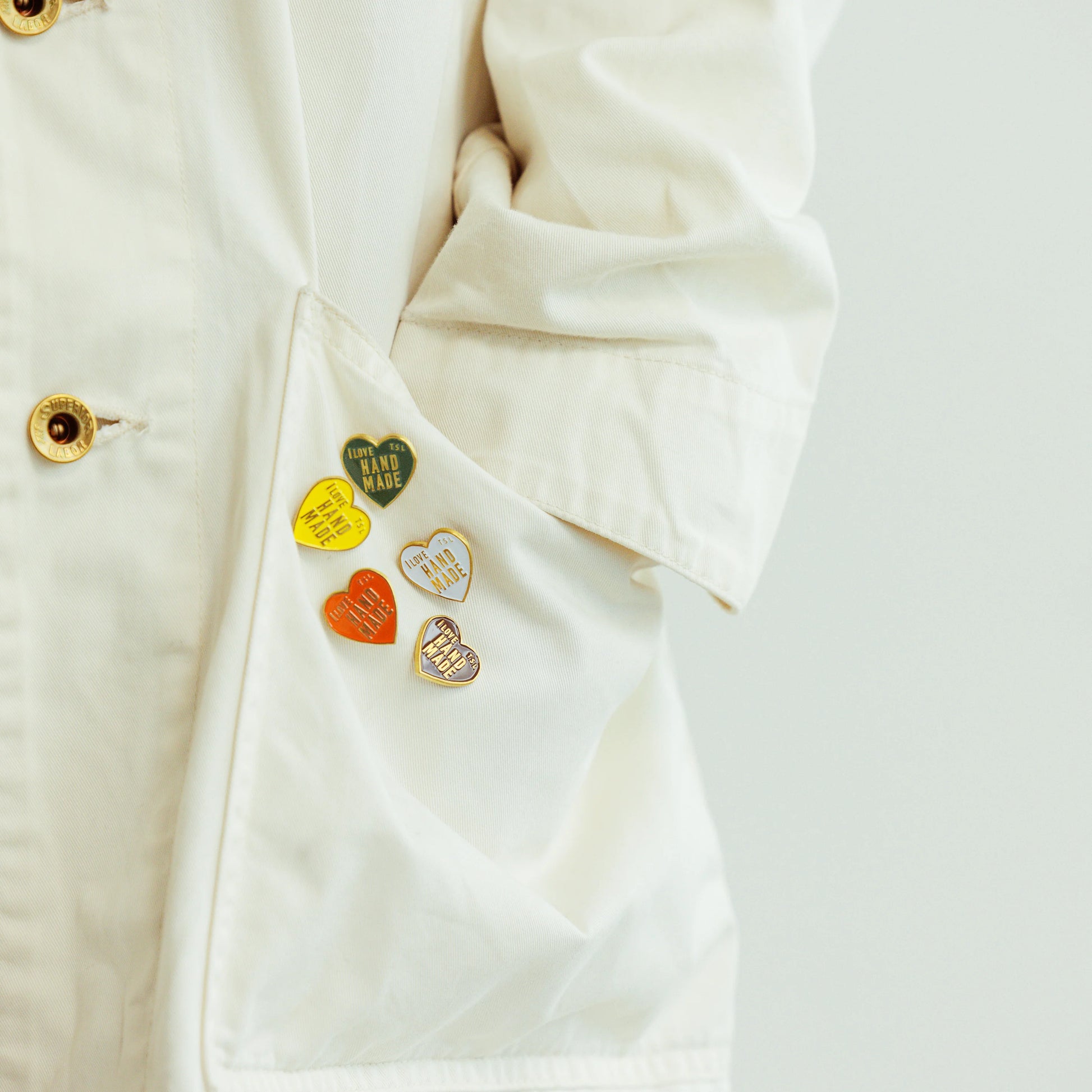 The familiar "I love HANDMADE" patch design is now available as a colorful pin. Available in 10 colors to match the paint colors of the engineer bag. The metal parts are made of solid brass with no plating. The color will dull as you use it, so enjoy the changes in its appearance over time.