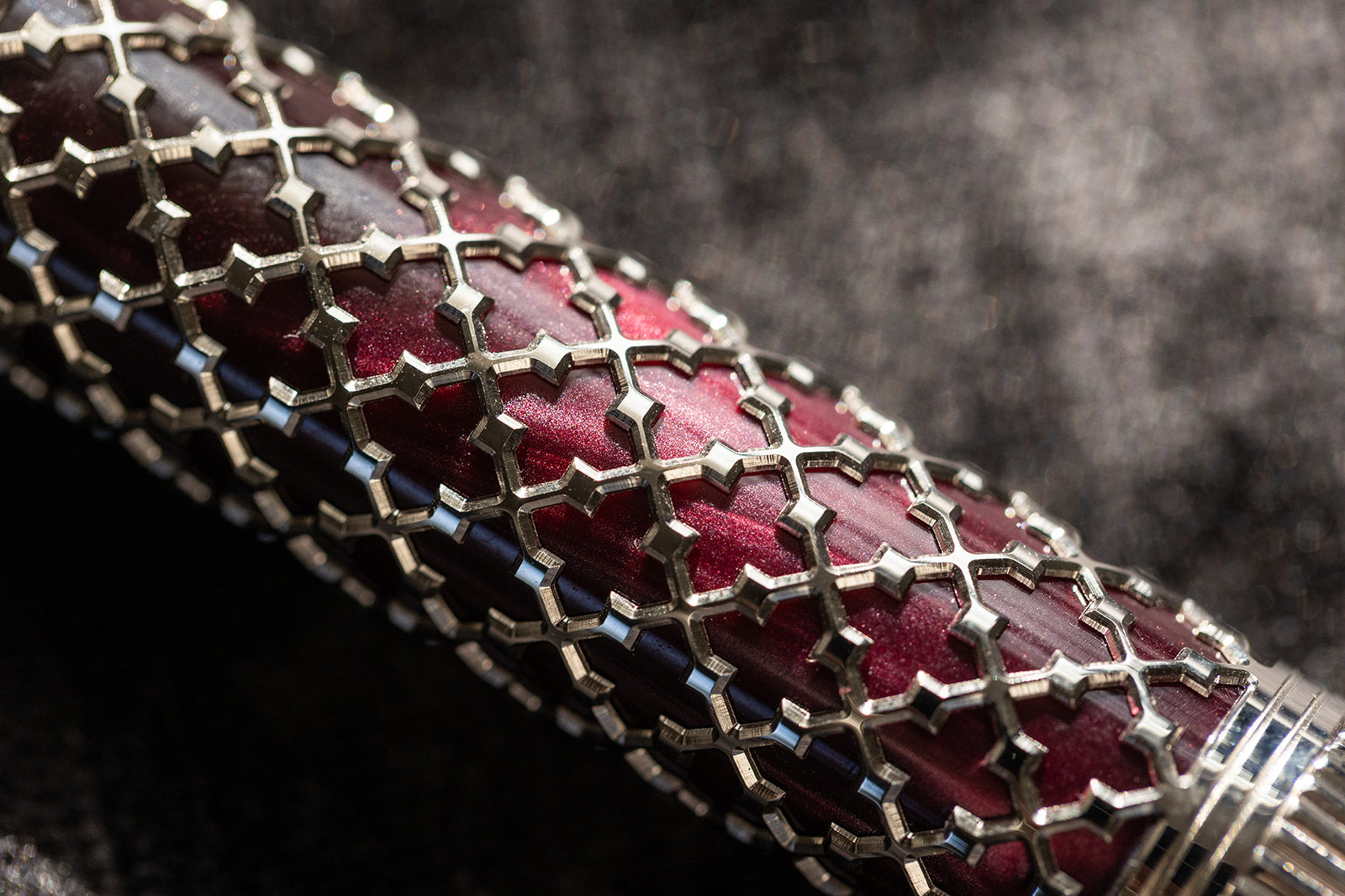 The silver filigree, inspired by the ornamental details of Venetian façades, envelops an inner iridescent red resin. A deep, vibrant hue that recalls the velvets of Venetian palaces - precious surfaces that transform under changing light. The contrast between metal and color creates an intense dialogue of materials, enhancing the perception of depth and lending the pen a rich, warm, and luminous elegance.